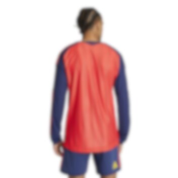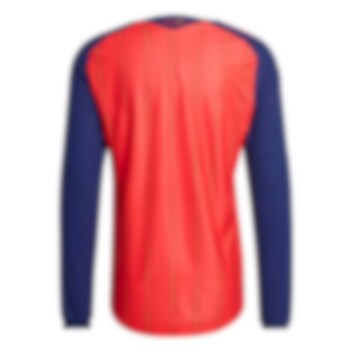 Designet kombinerer en dyp rød farge, med mørke marineblå ermer og 3-Stripes på skuldrene i rødt-gult-rødt.