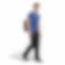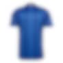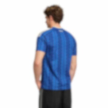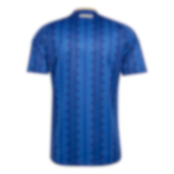 Designet har en kongeblå hovedfarge med unike, vertikale striper og en dus gultone på kragen og adidas-stripene.
