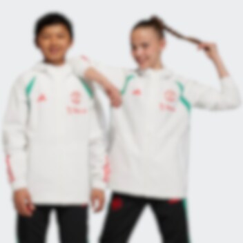 Denne Manchester United fotballjakken til barn fra adidas er en del av treningsserien spillerne bruker før kamp. Dette produktet er laget med resirkulert materiale.