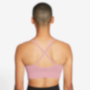 Nike Indy sports-BH er laget av et mykt. sømløst materiale og har en passform som gir en god følelse av å nesten gå uten. Den er komfortabel nok til hverdagsbruk eller til aktiviteter med lav intensitet. som yoga eller pilates. Svettetransporterende design gir luftsirkulasjon gjennom områder i ryggen som puster.